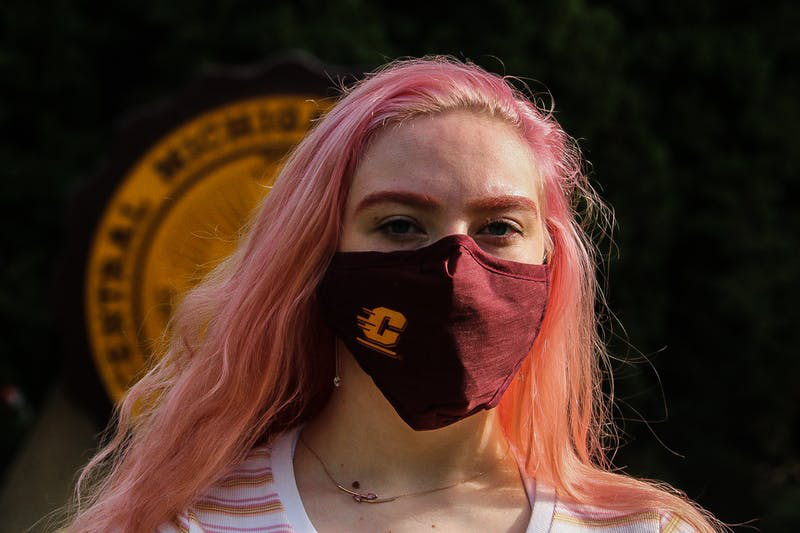 Hudsonville sophomore Olivia Copeland sits in front of the Central Michigan University seal Aug. 31.